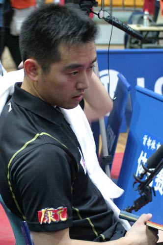 2004年乒联总决赛男单首日 孔令辉思考战术   北京时间2004年12月10日,国际乒联职业巡回赛总决赛今天在首都体育学院大学生体育馆拉开帷幕,在今天进行的一场男单1/4决赛中,中国选手孔令辉继世乒赛半决赛3-4不敌奥地利名将施拉格后再次落败,其中决胜局的比分与世乒赛完全一样,都是12-14。孔令辉无缘八强。图为比赛的精彩瞬间。
