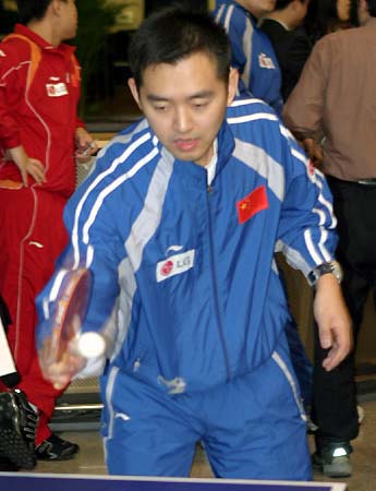 2004年国际乒联巡回赛总决赛将战 孔令辉横刀立马   2004年12月8日,为准备10日在北京揭幕的2004年国际乒联巡回赛总决赛,中国男队在教练刘国梁、韩华、肖战率领下,女队在主教练陆元盛和教练李隼的率领下到比赛场地进行了适应性训练。图为训练中的场景。