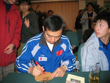 中国乒乓球队北大行 孔令辉为大学生签名   1月18日,中国乒乓球选手孔令辉(中)为大学生签名。当日,中国乒乓球队来到中国著名高等学府北京大学,与莘莘学子座谈、交流。北大正在筹建2008年奥运会乒乓球比赛场馆,年轻的乒乓国手和大学生相约:2008年奥运会,在北大再见!