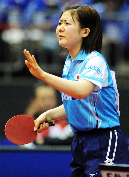横滨,2009年5月1日 (体育)(2)乒乓球——世乒赛:福原爱混双出局 5月1日,日本选手福原爱在比赛中。当日,在日本横滨举行的第50届世乒赛混双第二轮比赛中,福原爱/松平健太以3比4负于中华台北选手江宏杰/郑怡静,无缘下一轮。 新华社记者徐家军摄