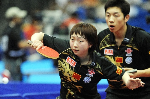 横滨,2009年5月1日 (体育)(1)乒乓球——世乒赛:许昕/范瑛挺进混双八强 5月1日,中国选手许昕(右)/范瑛在比赛中。当日,在日本横滨体育馆进行的第50届世界乒乓球锦标赛混双第四轮比赛中,许昕/范瑛以4比1战胜法国选手勒古/格兰迪施,晋级八强。 新华社记者徐家军摄
