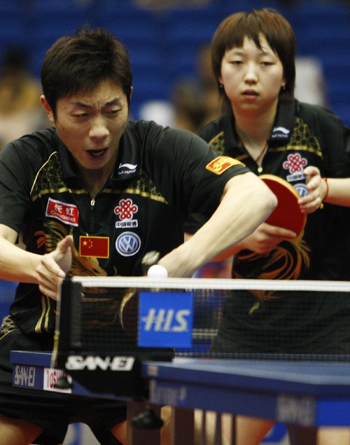 横滨(日本),2009年5月2日 (体育)(9)乒乓球——世乒赛:混双四分之一决赛赛况 5月2日,许昕/范瑛(右)在比赛中。当日,中国选手许昕/范瑛在日本横滨举行的第50届世乒赛混双四分之一决赛中,以0比4不敌队友李平/曹臻,无缘四强。 新华社记者毕明明摄