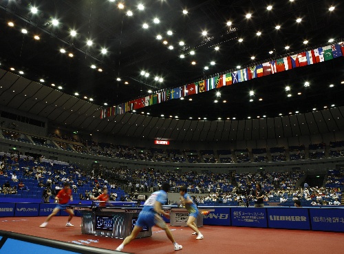 横滨,2009年5月3日 (体育)(6)乒乓球——世乒赛:李平/曹臻夺冠 5月3日,中国选手李平/曹臻、张继科/木子在比赛中。当日,在日本横滨体育馆进行的第50届世界乒乓球锦标赛混合双打决赛中,中国选手李平/曹臻以4比2战胜队友张继科/木子,夺得冠军。 新华社记者毕明明摄
