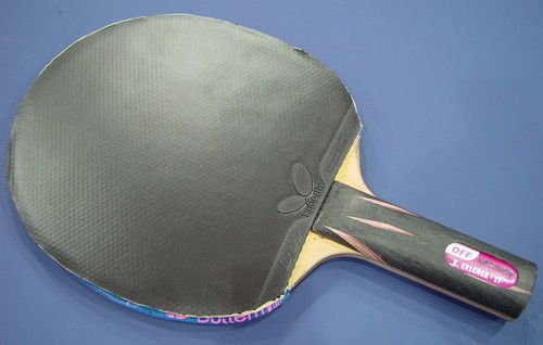 我发现格林卡的球拍与一般的ST柄不太一样!————握拍时,拍柄大拇指位置的那个“斜坡”的角度好像很大,看上去与拍柄柄身像是没有明显的夹角。那一面也一样。