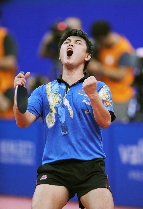 青岛,2009年10月2日 (体育)(14)乒乓球——全运会:王皓获得男单冠军 10月2日,王皓庆祝胜利。当日,在青岛举行的第十一届全国运动会乒乓球男子单打决赛中,解放军队选手王皓以4比2战胜北京队选手马龙,获得冠军。 新华社记者李紫恒摄