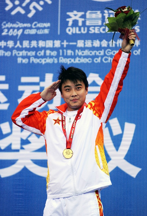 青岛,2009年10月2日 (体育)(7)乒乓球——全运会:王皓获得男单冠军 10月2日,王皓在领奖台上向观众行军礼。当日,在青岛举行的第十一届全国运动会乒乓球男子单打决赛中,解放军队选手王皓以4比2战胜北京队选手马龙,获得冠军。 新华社记者李紫恒摄