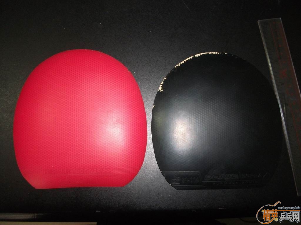 、挺拔一闪SINUS A ,红色,极品暴力弧圈外套,有兴趣可上网找测评,成色八九成新,胶皮呈梅红色,底部有个磕伤,海绵无任何伤,平铺后量是152*148*93,灌点胶做横拍反手是没什么大问题。有兴趣的朋友可以尝尝鲜。(已出给 zgd11 网友