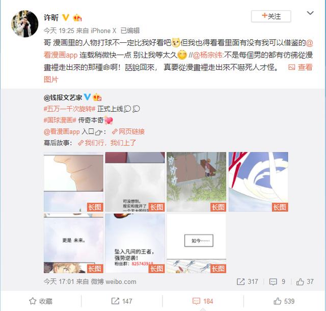 在刚刚结束的瑞典公开赛和奥地利公开赛中,许昕两度打进男单决赛。虽然均不敌对手取得了男单亚军的成绩,但许昕保持了一个很好的的状态。11月12日晚间,许昕的偶像杨宗纬转发了一条“广告”。这条广告讲述的是以乒乓球为主题的漫画,“追星昕”随后立即转发道:“ 哥 漫画里的人物打球不一定比我好看吧 但我也得看看里面有没有我可以借鉴的@看漫画app 连载稍微快一点 别让我等太久”
