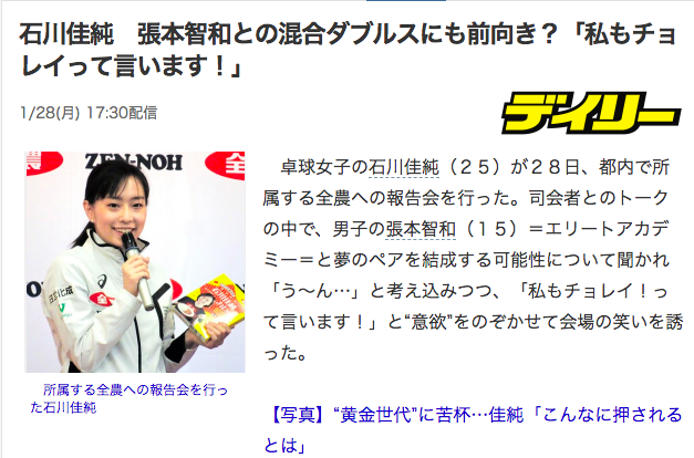 北京时间1月28日,日本乒球名将石川佳纯当天出席所属的赞助商的报告会,被问及和15岁的华裔神童张本智和将组成混双的传闻,她表现出积极的态度:“嗯,我也想在场上大吼chiyorei(注:这是张本习惯在场上大吼的日语,无特别含义。)。”