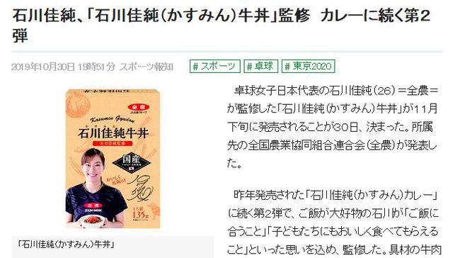 近日据日本媒体报道,由日本乒乓球名将石川佳纯(26岁)担任监制的同名产品——“石川佳纯牛肉盖饭”将于11月下旬上市。