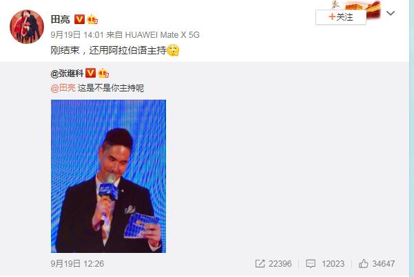 9月19日,张继科微博上晒出一张男主持人的照片,并且@田亮,是不是你主持?